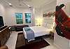 The master suite is a sanctuary of its own. Set against rich wood-paneled walls, the bedroom is spacious and serene, while the ensuite bathroom rivals a spa. Featuring a striking black-and-white marble design, dual rainfall showers, a freestanding soaking tub, and sleek gold fixtures, it’s the perfect place to unwind after a day in the sun.